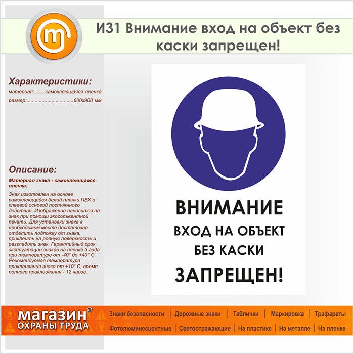 Знак «Внимание вход на объект без каски запрещен!», И31 (пленка, 600х900 мм) в Ачинске купить