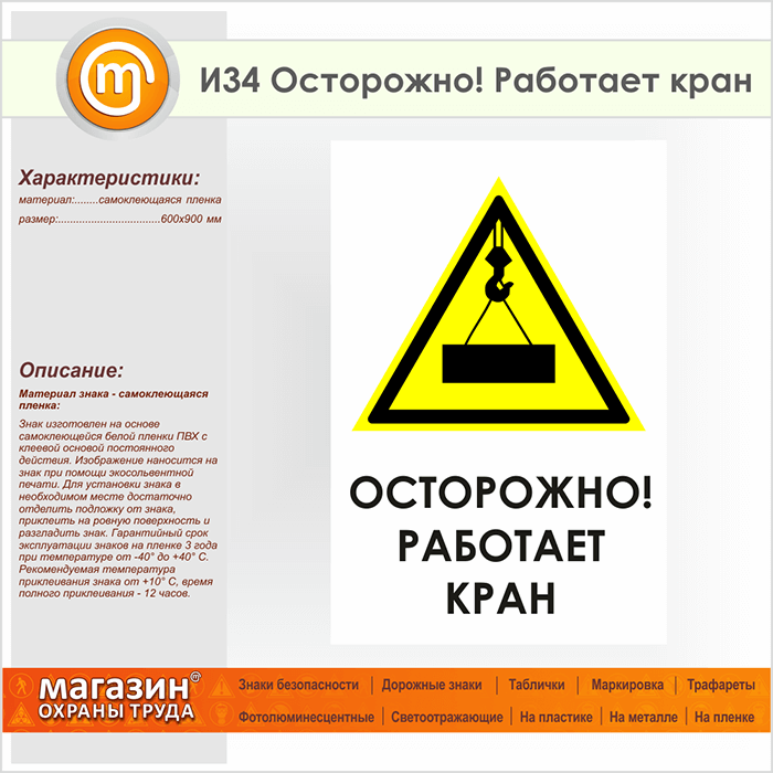 Знак «Осторожно! Работает кран», И34 (пленка, 600х900 мм) в Ачинске купить