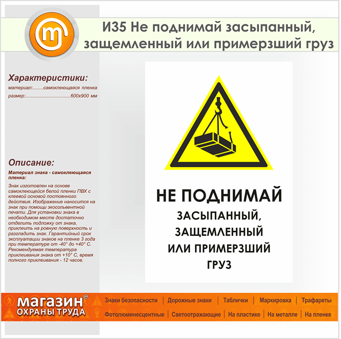 Знак «Не поднимай засыпанный, защемленный или примерзший груз», И35 (пленка, 600х900 мм) в Ачинске купить
