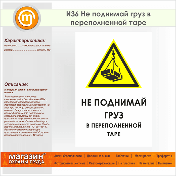 Знак «Не поднимай груз в переполненной таре», И36 (пленка, 600х900 мм) в Ачинске купить