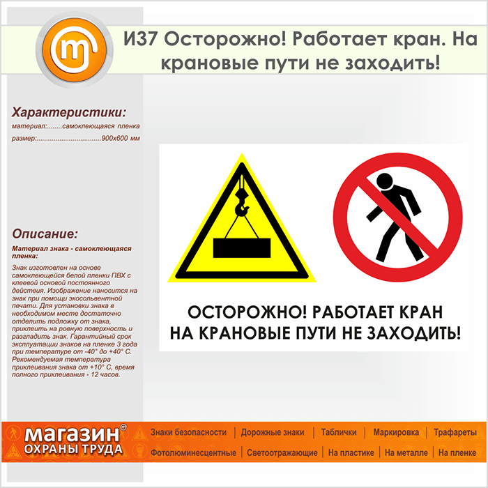 Знак «Осторожно! Работает кран. На крановые пути не заходить!», И37 (пленка, 900х600 мм) в Ачинске купить