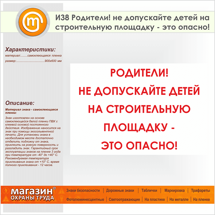 Знак «Родители! не допускайте детей на строительную площадку - это опасно!», И38 (пленка, 900х600 мм) в Ачинске купить