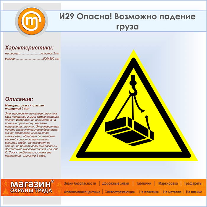 Знак «Опасно! Возможно падение груза», И29 (пластик, сторона 500 мм) в Ачинске купить