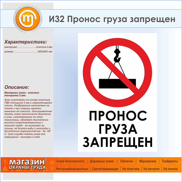 Знак «Пронос груза запрещен», И32 (пластик, 600х900 мм) в Ачинске купить