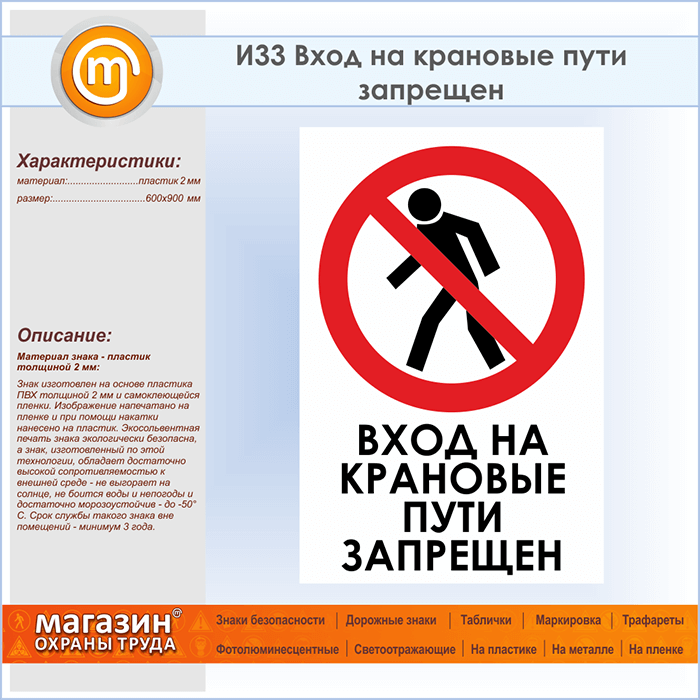 Знак «Вход на крановые пути запрещен», И33 (пластик, 600х900 мм) в Ачинске купить
