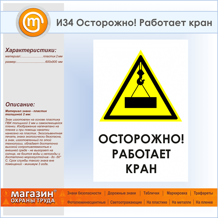 Знак «Осторожно! Работает кран», И34 (пластик, 600х900 мм) в Ачинске купить
