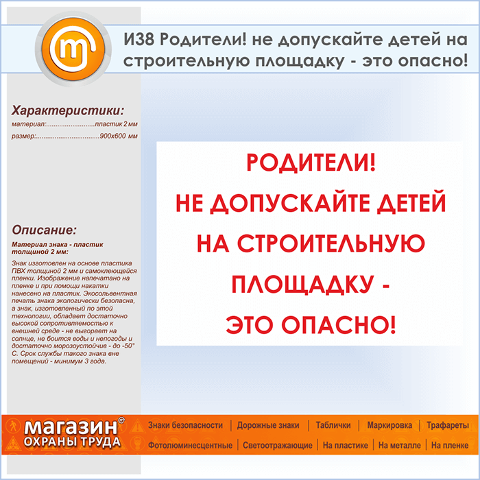 Знак «Родители! не допускайте детей на строительную площадку - это опасно!», И38 (пластик, 900х600 мм) в Ачинске купить