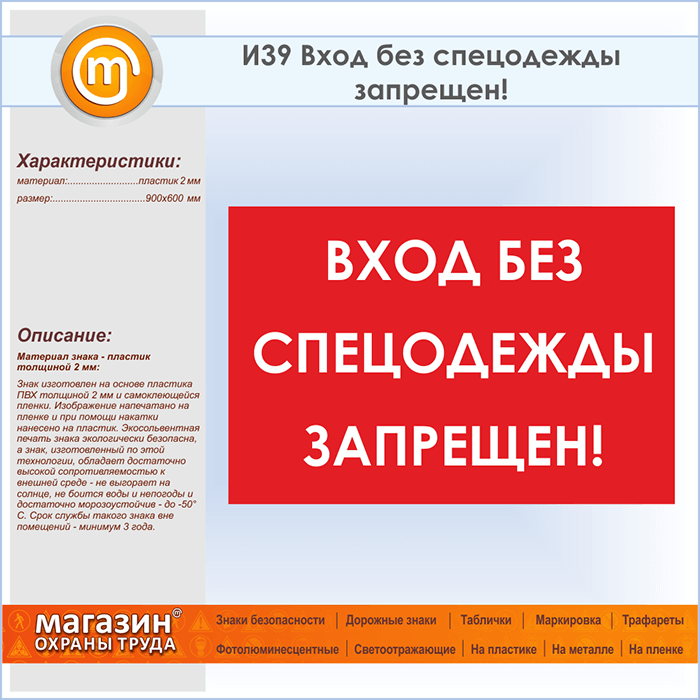 Знак «Вход без спецодежды запрещен!», И39 (пластик, 900х600 мм) в Ачинске купить