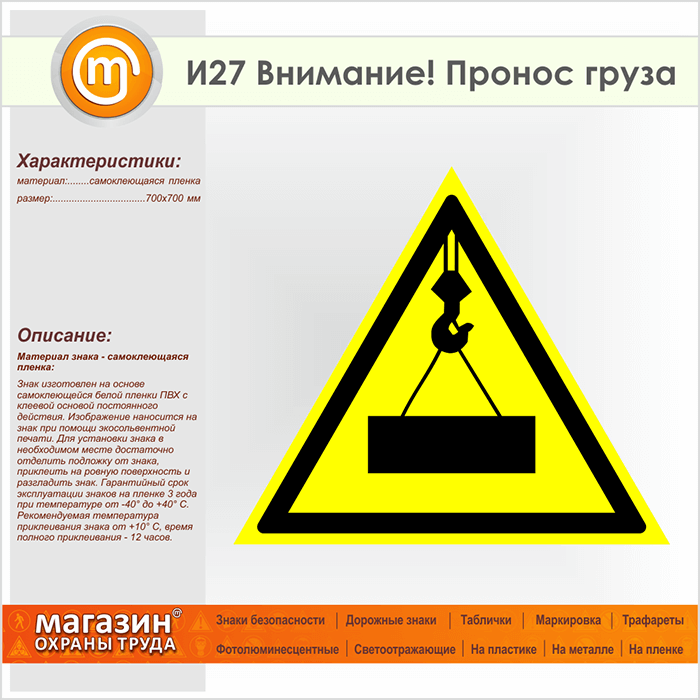 Знак «Внимание! Пронос груза», И27 (пленка, сторона 700 мм) в Ачинске купить