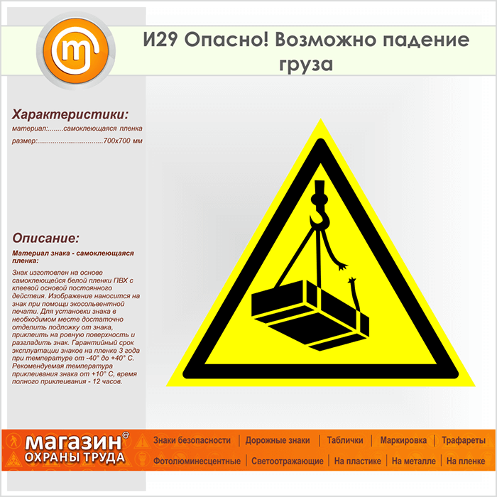 Знак «Опасно! Возможно падение груза», И29 (пленка, сторона 700 мм) в Ачинске купить