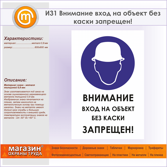 Знак «Внимание вход на объект без каски запрещен!», И31 (металл, 600х900 мм) в Ачинске купить