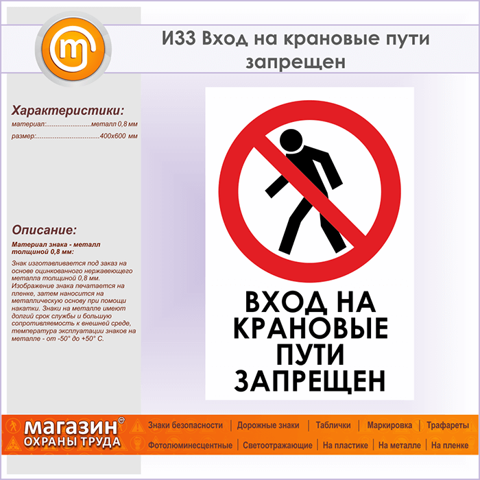 Знак «Вход на крановые пути запрещен», И33 (металл, 400х600 мм) в Ачинске купить