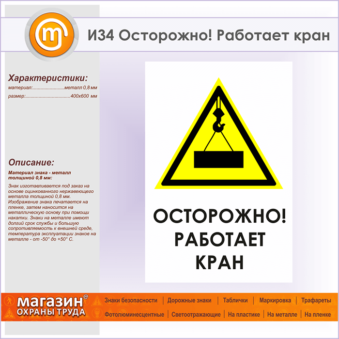 Знак «Осторожно! Работает кран», И34 (металл, 400х600 мм) в Ачинске купить