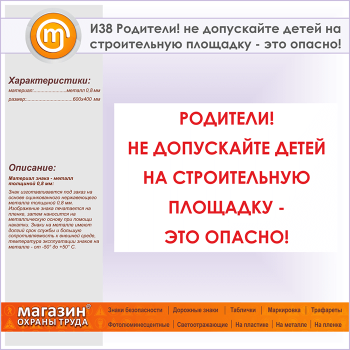 Знак «Родители! не допускайте детей на строительную площадку - это опасно!», И38 (металл, 600х400 мм) в Ачинске купить
