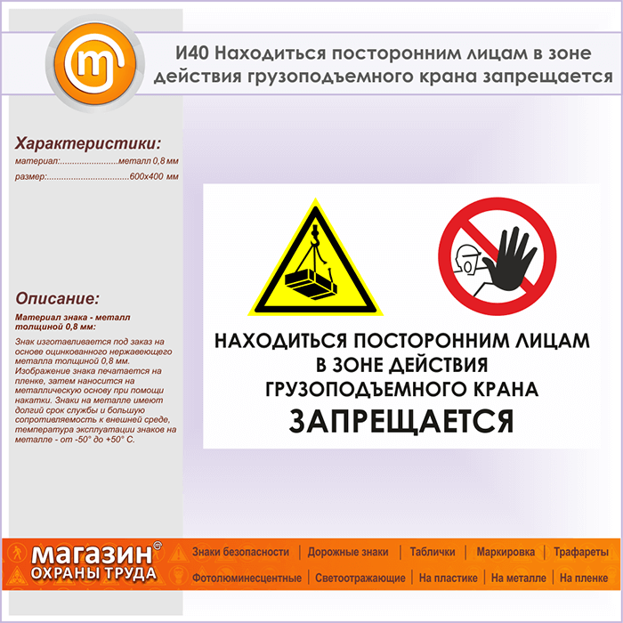 Знак «Находиться посторонним лицам в зоне действия грузоподъемного крана запрещается», И40 (металл, 600х400 мм) в Ачинске купить