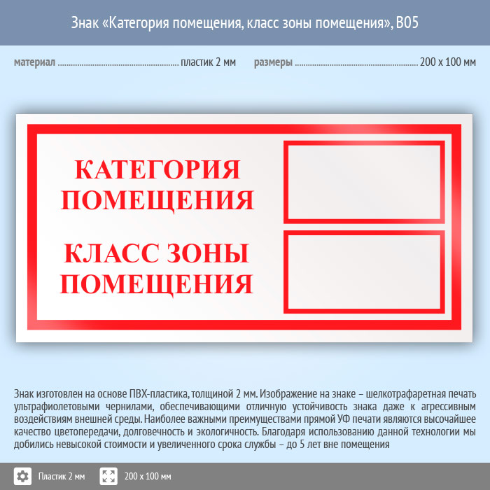 Знак «Категория помещения, класс зоны помещения», B05 (пластик, 200х100 мм) в Ачинске купить