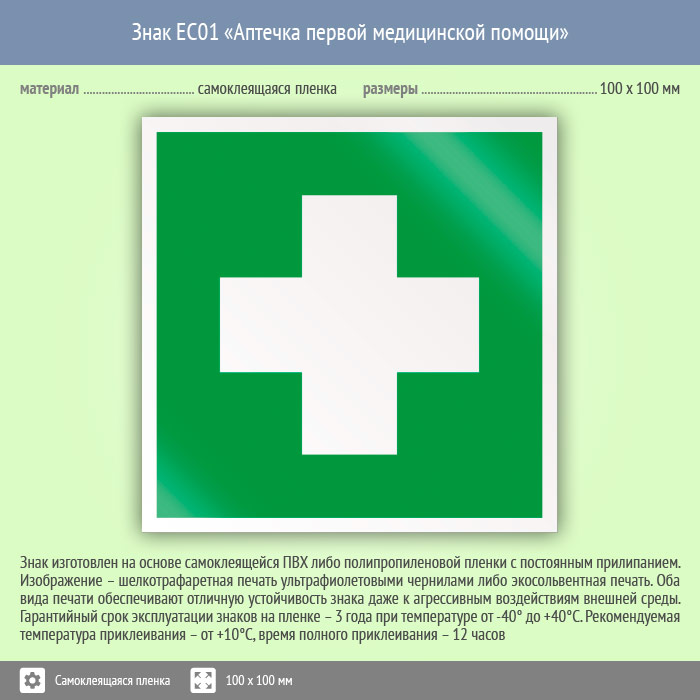 Знак EC01 «Аптечка первой медицинской помощи» (пленка, 100х100 мм) в Ачинске купить