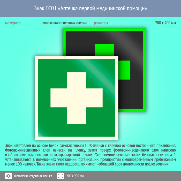 Знак EC01 «Аптечка первой медицинской помощи» (фотолюминесцентная пленка, 200х200 мм) в Ачинске купить
