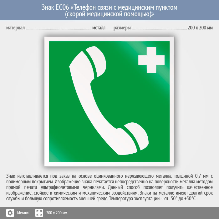 Знак EC06 «Телефон связи с медицинским пунктом (скорой медицинской помощью)» (металл, 200х200 мм) в Ачинске купить