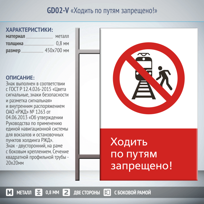Знак «Ходить по путям запрещено!», GD02-V (двусторонний вертикальный, 450х700 мм, металл, на раме с боковым креплением) в Ачинске купить