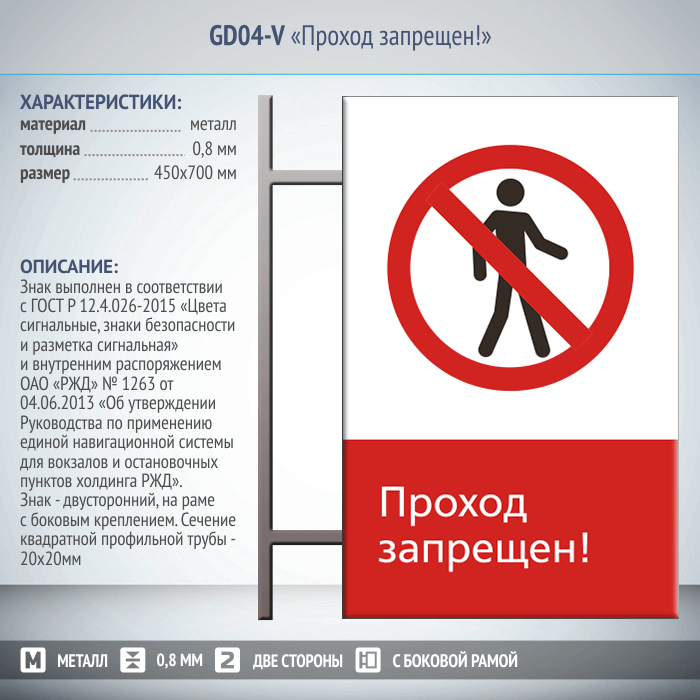 Знак «Проход запрещен!», GD04-V (двусторонний вертикальный, 450х700 мм, металл, на раме с боковым креплением) в Ачинске купить