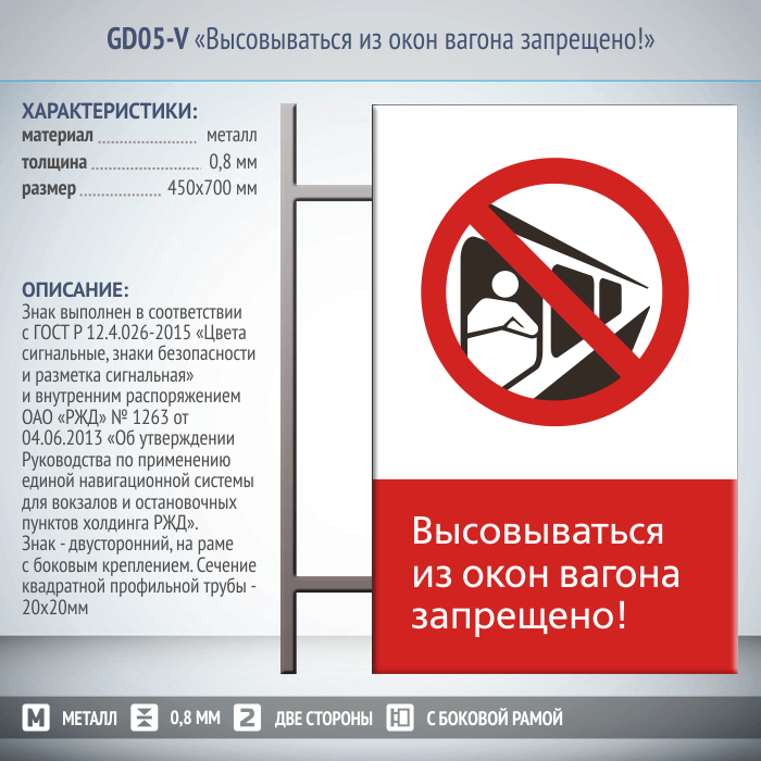 Знак «Высовываться из окон вагона запрещено!», GD05-V (двусторонний вертикальный, 450х700 мм, металл, на раме с боковым креплением) в Ачинске купить