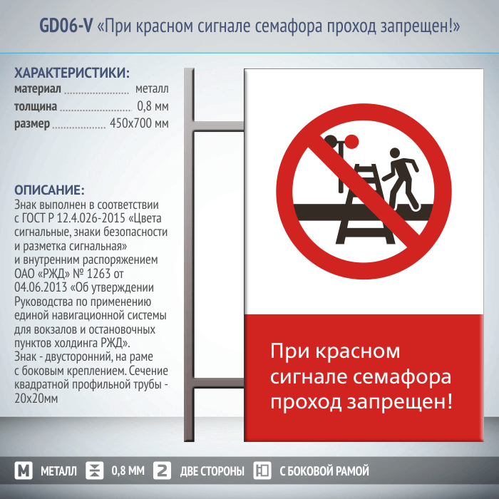 Знак «При красном сигнале семафора проход запрещен!», GD06-V (двусторонний вертикальный, 450х700 мм, металл, на раме с боковым креплением) в Ачинске купить
