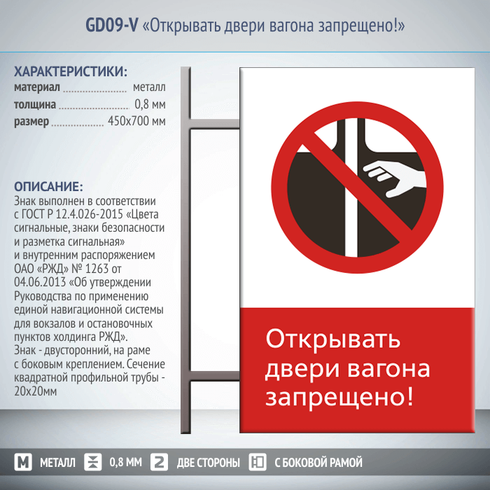 Знак «Открывать двери вагона запрещено!», GD09-V (двусторонний вертикальный, 450х700 мм, металл, на раме с боковым креплением) в Ачинске купить