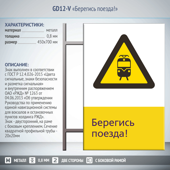 Знак «Берегись поезда!», GD12-V (двусторонний вертикальный, 450х700 мм, металл, на раме с боковым креплением) в Ачинске купить