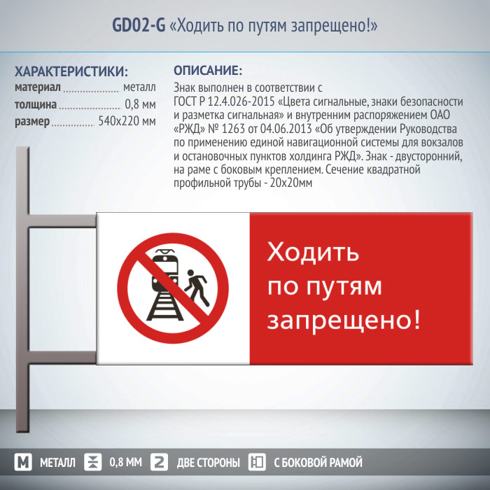 Знак «Ходить по путям запрещено!», GD02-G (двусторонний горизонтальный, 540х220 мм, металл, на раме с боковым креплением) в Ачинске купить