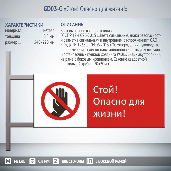 Знак «Стой! Опасно для жизни!», GD03-G (двусторонний горизонтальный, 540х220 мм, металл, на раме с боковым креплением) в Ачинске купить
