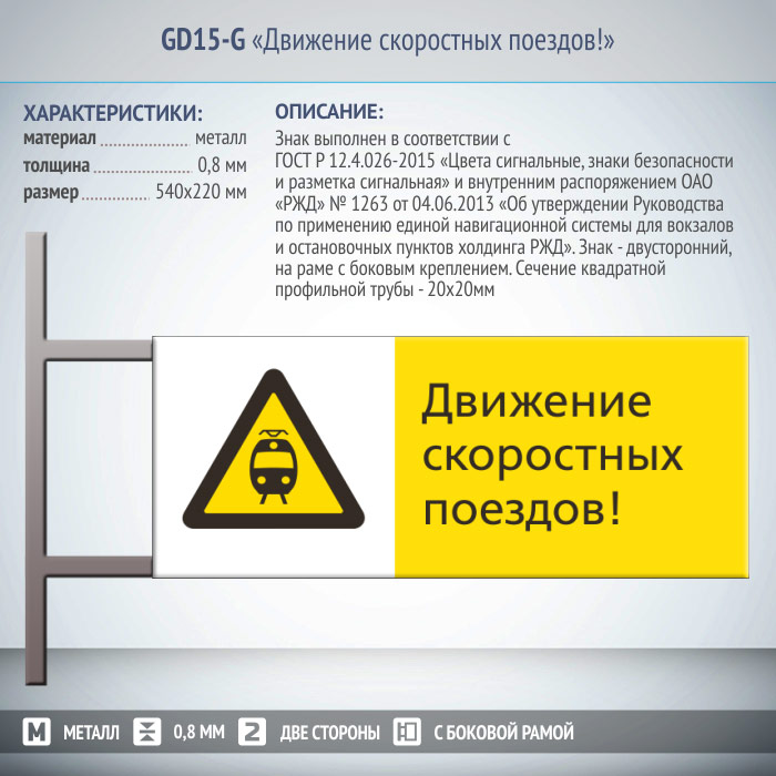 Знак «Движение скоростных поездов!», GD15-G (двусторонний горизонтальный, 540х220 мм, металл, на раме с боковым креплением) в Ачинске купить