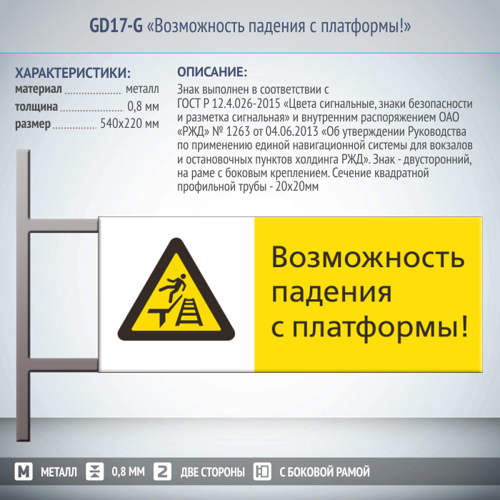 Знак «Возможность падения с платформы!», GD17-G (двусторонний горизонтальный, 540х220 мм, металл, на раме с боковым креплением) в Ачинске купить