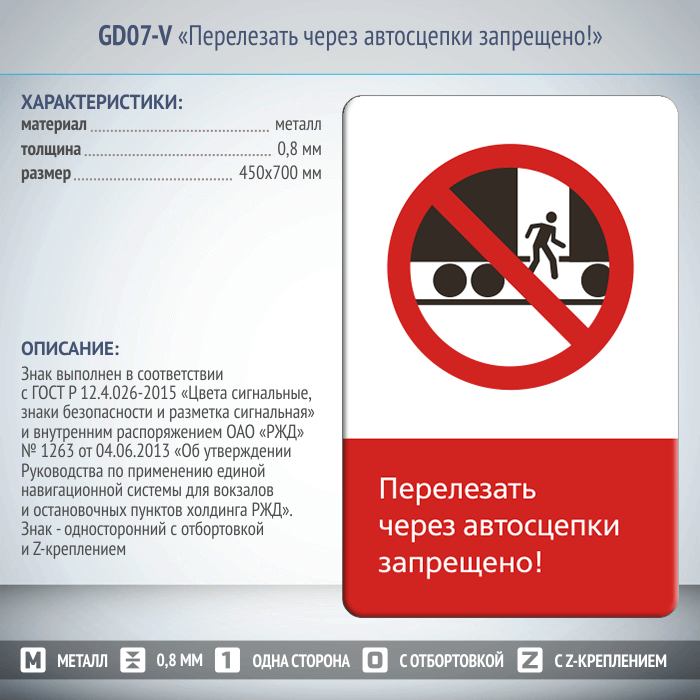 Знак «Перелезать через автосцепки запрещено!», GD07-V (односторонний вертикальный, 450х700 мм, металл, с отбортовкой и Z-креплением) в Ачинске купить