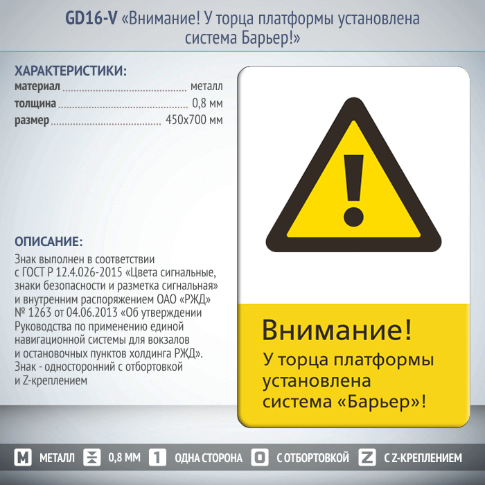 Знак «Внимание! У торца платформы установлена система Барьер!», GD16-V (односторонний вертикальный, 450х700 мм, металл, с отбортовкой и Z-креплением) в Ачинске купить