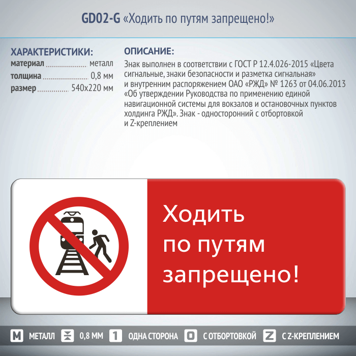 Знак «Ходить по путям запрещено!», GD02-G (односторонний горизонтальный, 540х220 мм, металл, с отбортовкой и Z-креплением) в Ачинске купить