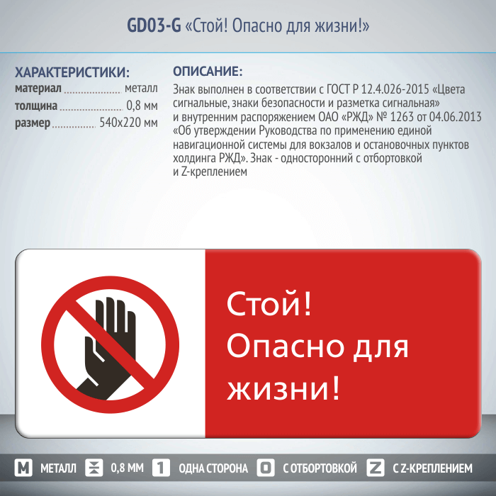 Знак «Стой! Опасно для жизни!», GD03-G (односторонний горизонтальный, 540х220 мм, металл, с отбортовкой и Z-креплением) в Ачинске купить