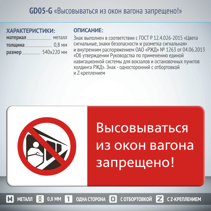 Знак «Высовываться из окон вагона запрещено!», GD05-G (односторонний горизонтальный, 540х220 мм, металл, с отбортовкой и Z-креплением) в Ачинске купить
