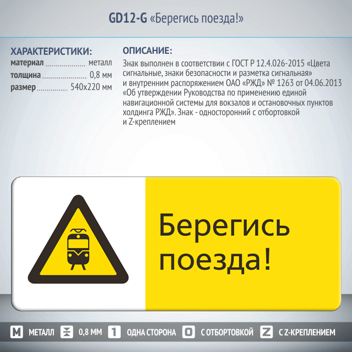 Знак «Берегись поезда!», GD12-G (односторонний горизонтальный, 540х220 мм, металл, с отбортовкой и Z-креплением) в Ачинске купить
