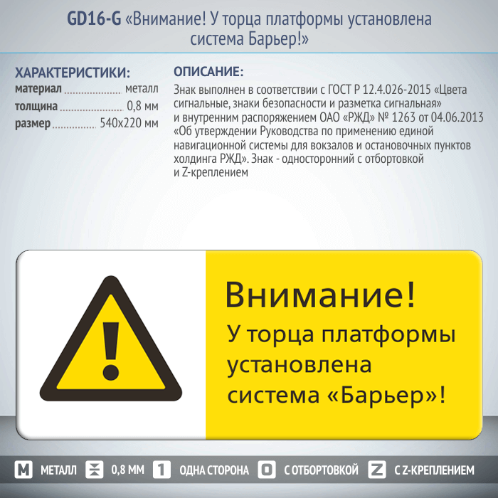 Знак «Внимание! У торца платформы установлена система Барьер!», GD16-G (односторонний горизонтальный, 540х220 мм, металл, с отбортовкой и Z-креплением) в Ачинске купить