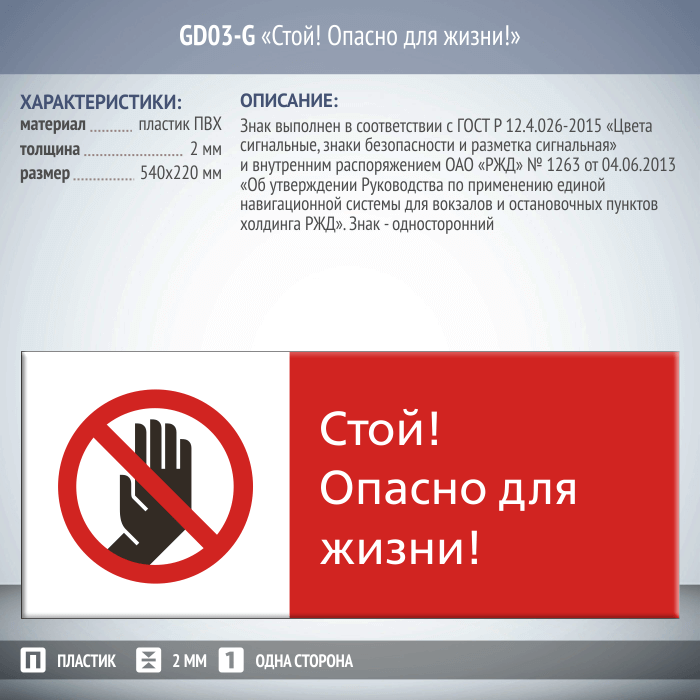 Знак «Стой! Опасно для жизни!», GD03-G (односторонний горизонтальный, 540х220 мм, пластик 2 мм) в Ачинске купить