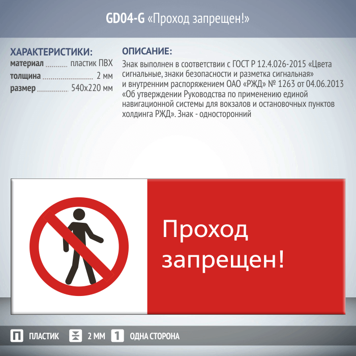 Знак «Проход запрещен!», GD04-G (односторонний горизонтальный, 540х220 мм, пластик 2 мм) в Ачинске купить
