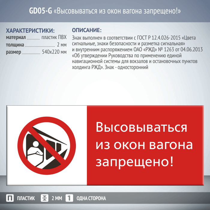 Знак «Высовываться из окон вагона запрещено!», GD05-G (односторонний горизонтальный, 540х220 мм, пластик 2 мм) в Ачинске купить
