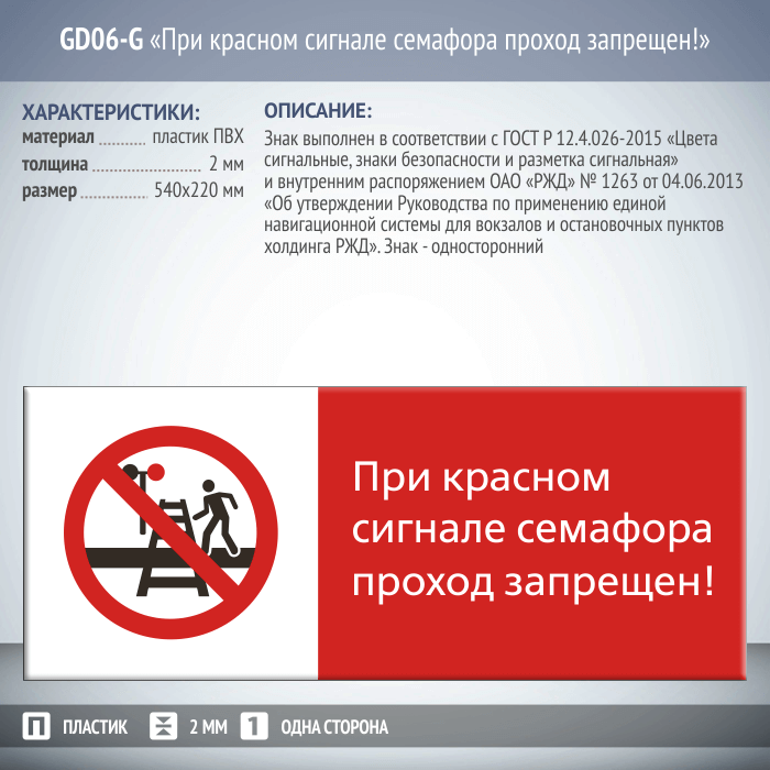 Знак «При красном сигнале семафора проход запрещен!», GD06-G (односторонний горизонтальный, 540х220 мм, пластик 2 мм) в Ачинске купить