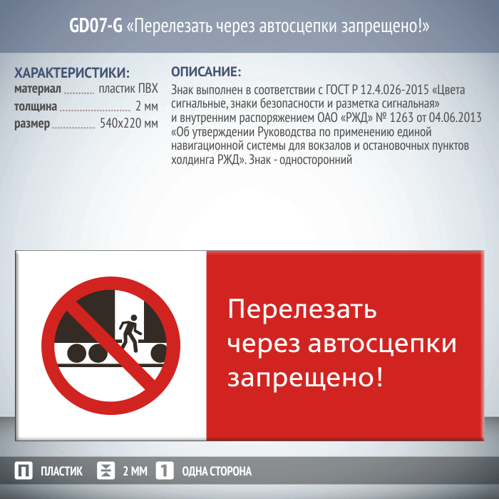 Знак «Перелезать через автосцепки запрещено!», GD07-G (односторонний горизонтальный, 540х220 мм, пластик 2 мм) в Ачинске купить