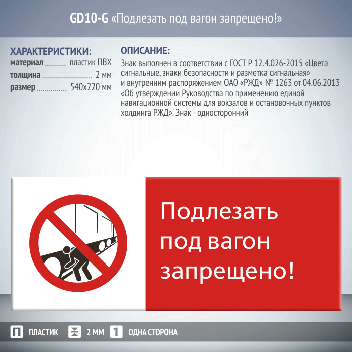Знак «Подлезать под вагон запрещено!», GD10-G (односторонний горизонтальный, 540х220 мм, пластик 2 мм) в Ачинске купить
