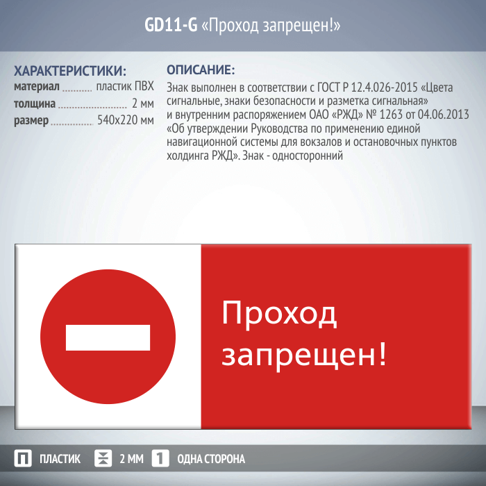 Знак «Проход запрещен!», GD11-G (односторонний горизонтальный, 540х220 мм, пластик 2 мм) в Ачинске купить