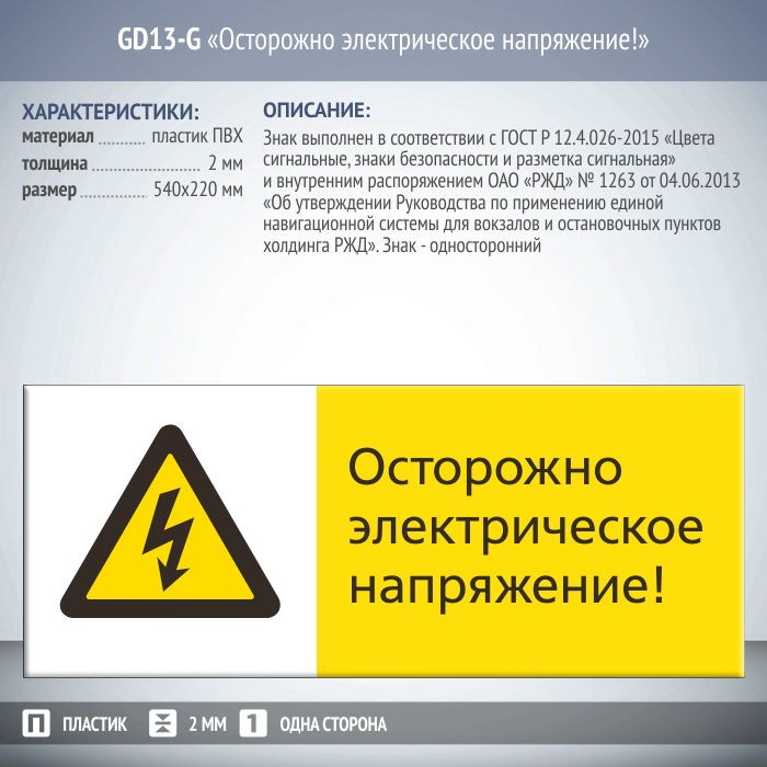 Знак «Осторожно электрическое напряжение!», GD13-G (односторонний горизонтальный, 540х220 мм, пластик 2 мм) в Ачинске купить