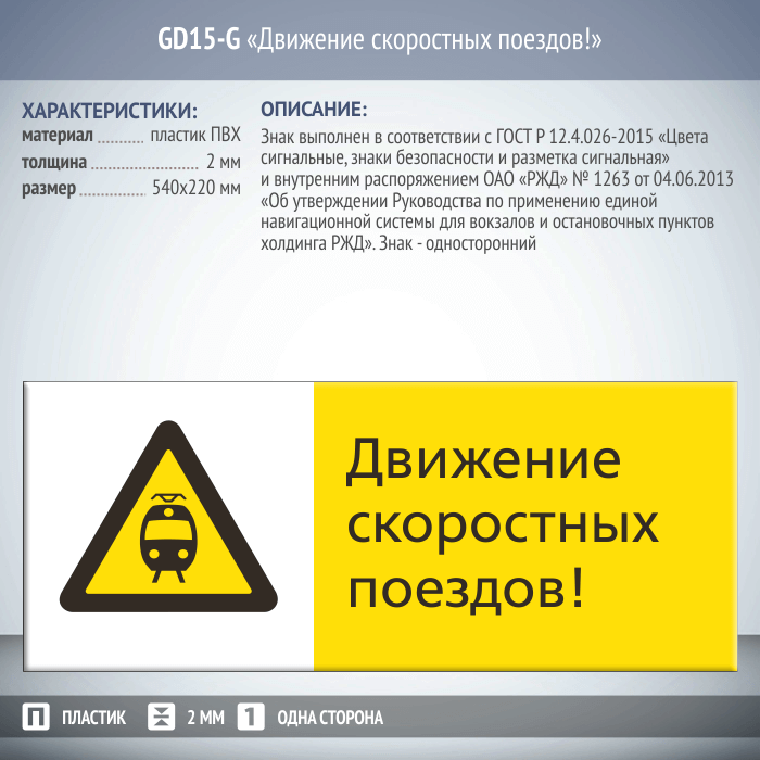 Знак «Движение скоростных поездов!», GD15-G (односторонний горизонтальный, 540х220 мм, пластик 2 мм) в Ачинске купить