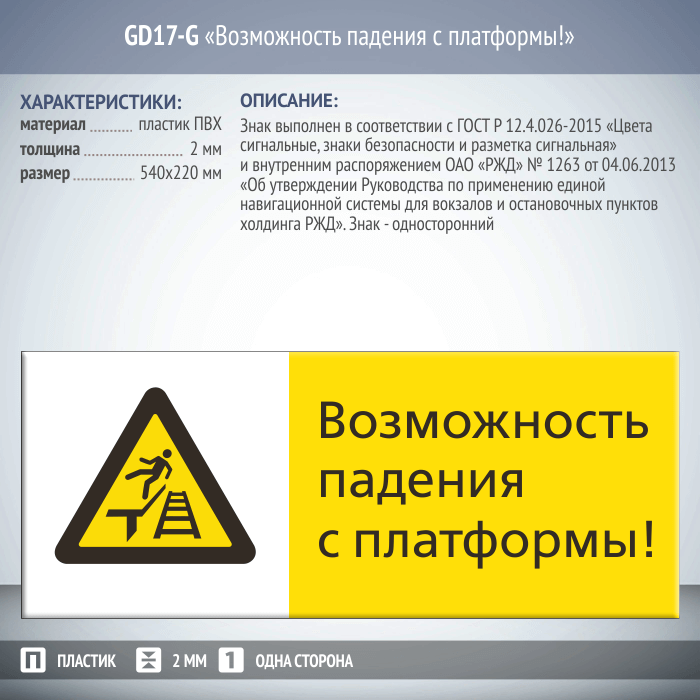 Знак «Возможность падения с платформы!», GD17-G (односторонний горизонтальный, 540х220 мм, пластик 2 мм) в Ачинске купить